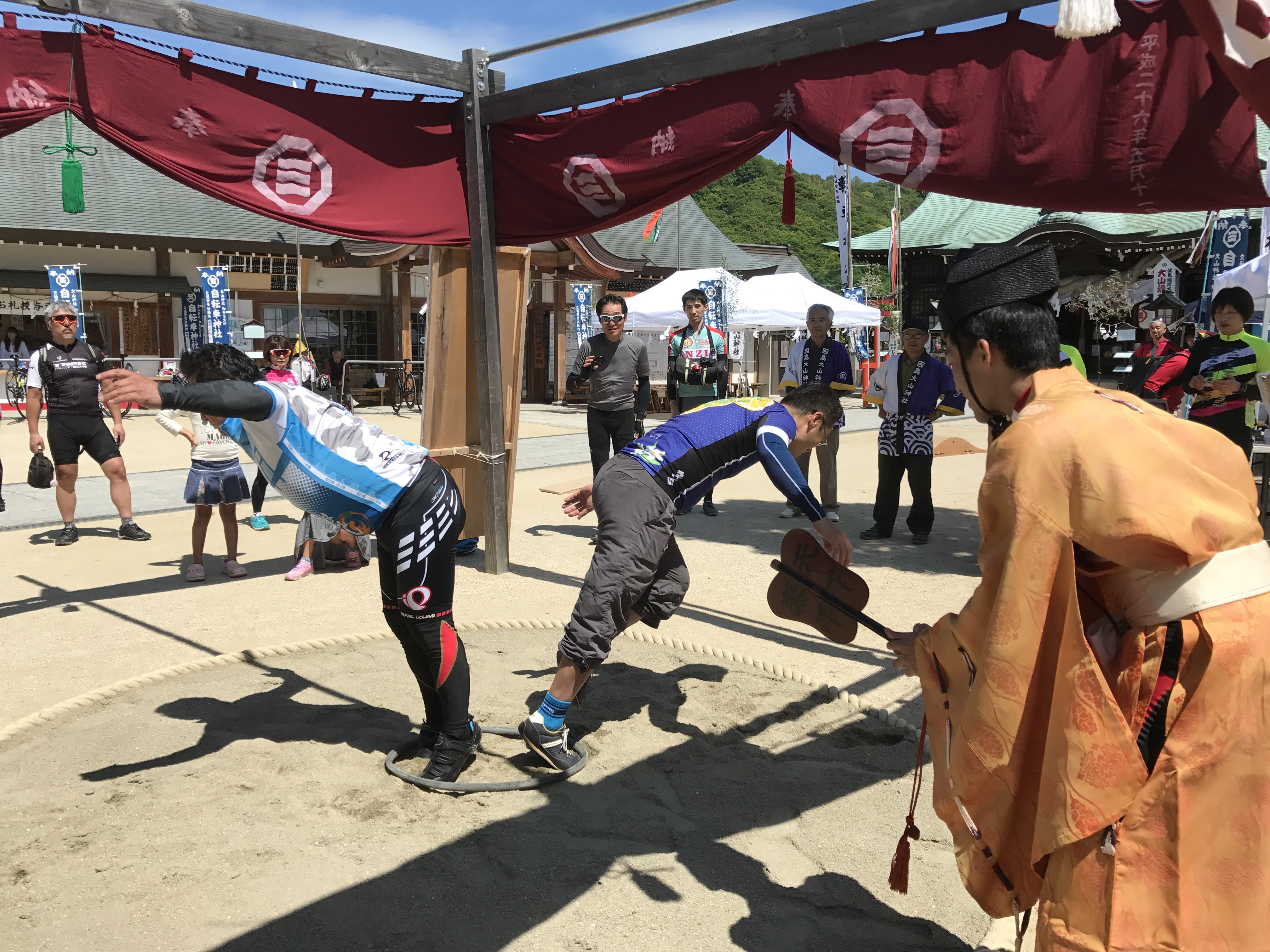相撲場にて、サイクリストさんの尻相撲を行います。