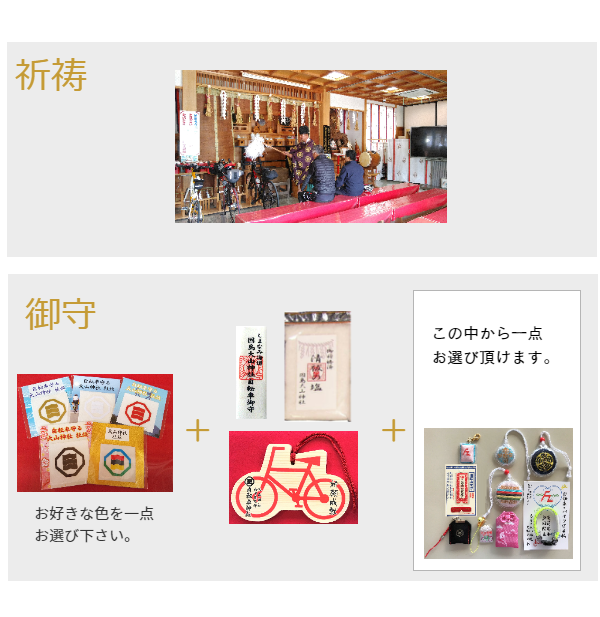 授与品(自転車ステッカー御守 + 清め塩 + 自転車絵馬 + ヘルメット安全御守 + ※お好きな自転車用お守り付)
