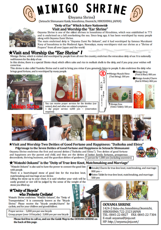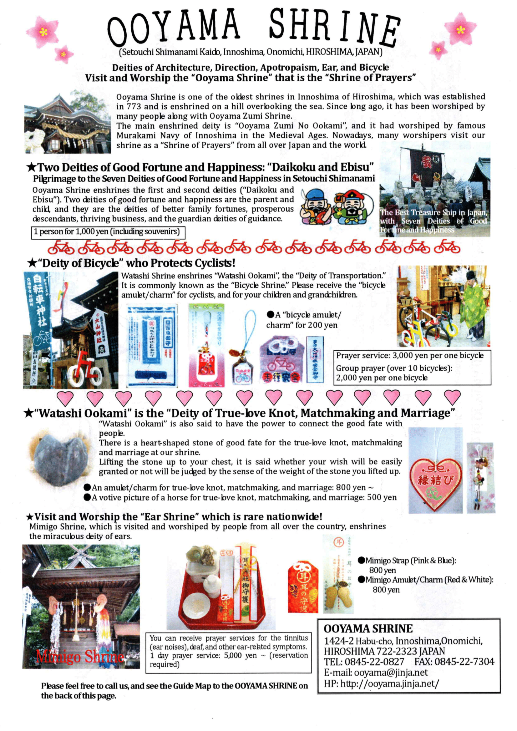 The main enshrined deity is “Ooyama Zumi No Ookami”, and it was once worshiped by the famous Murakami Navy of Innoshima during the Medieval Ages. Nowadays, many worshipers visit our shrine as a “Shrine of Prayers” from all over Japan and the world.
