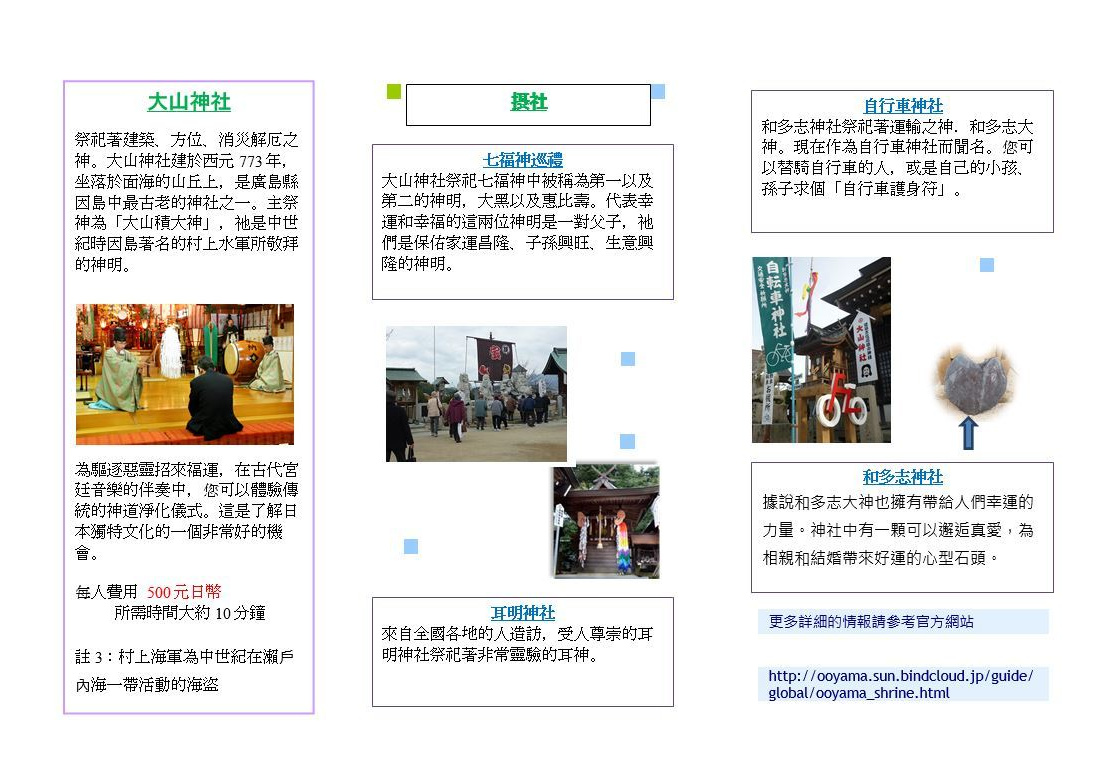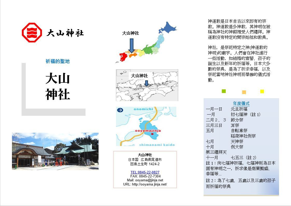 祭祀著建築、方位、消災解厄之神。大山神社建於西元773年,坐落於面海的山丘上,是廣島縣因島中最古老的神社之一。