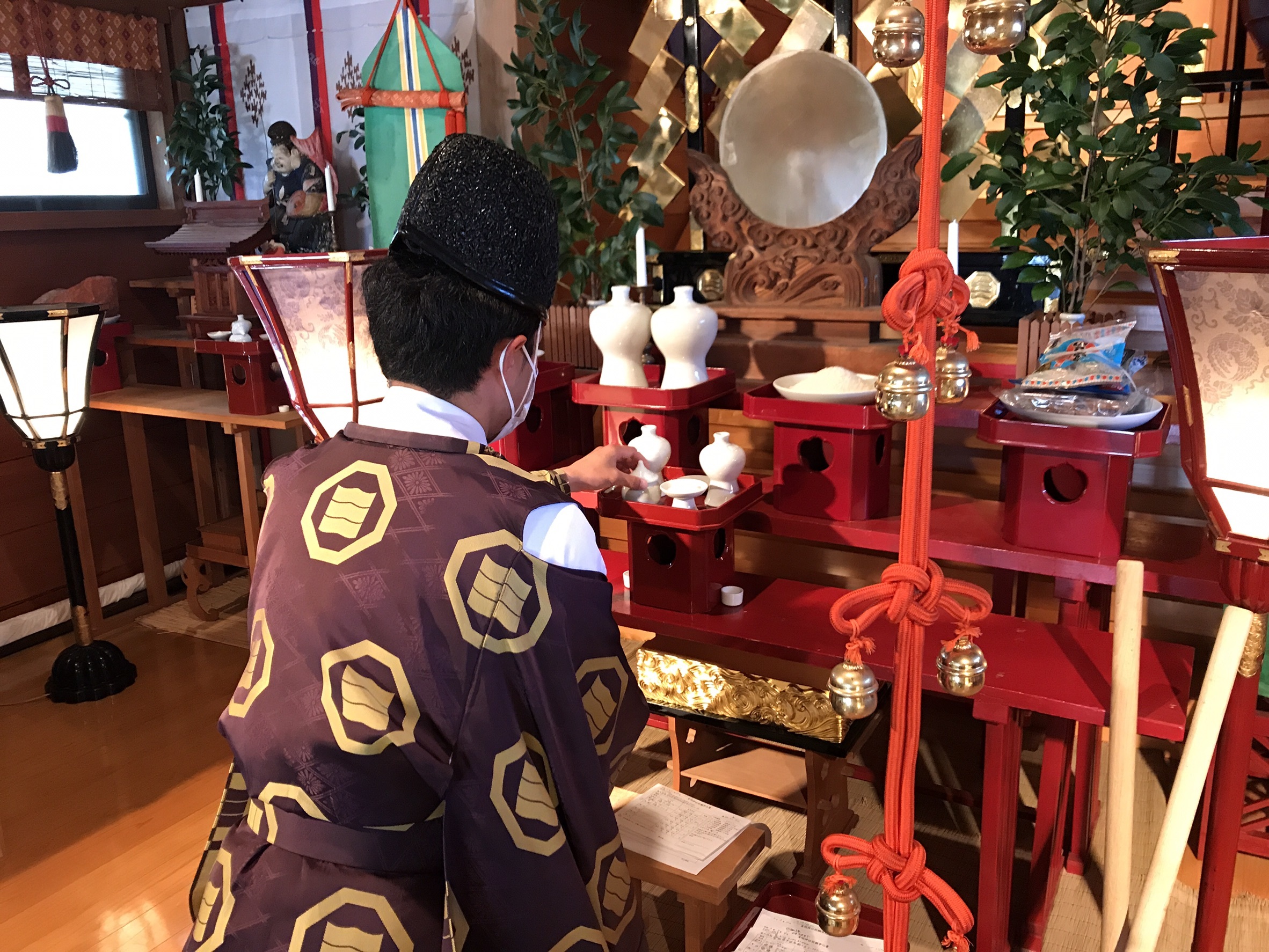 祓いの後、餞(せん)を進め、祝詞を奏し、お神楽を奏上する。