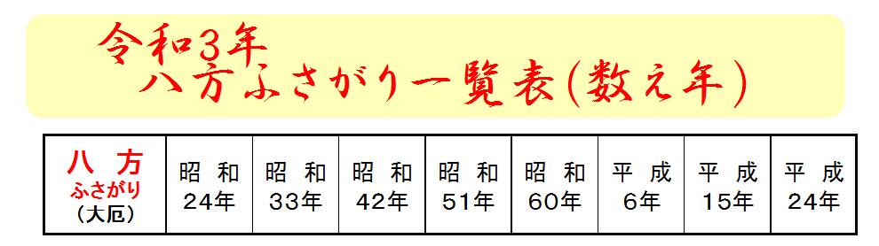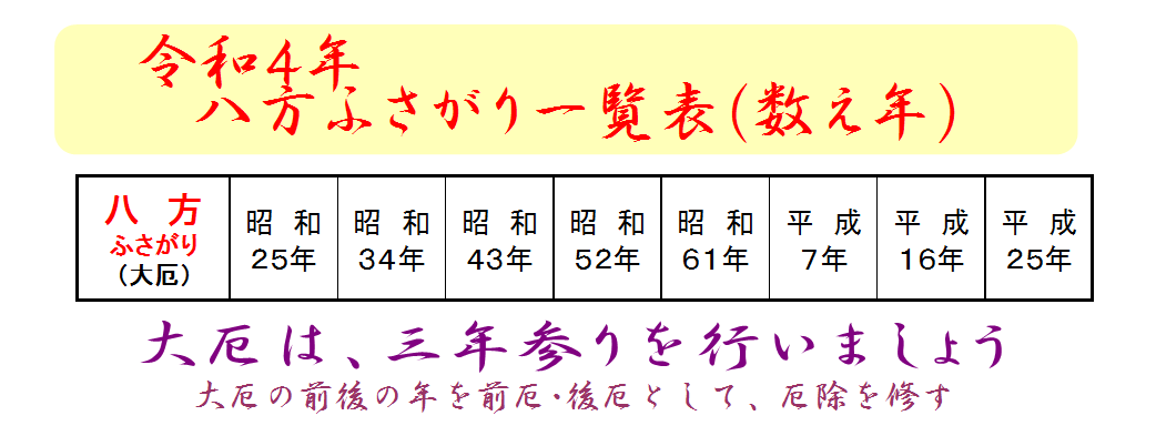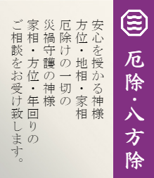 八方塞の年には、八方除のご祈祷を受けられ、地相・家相・方位・日柄等から来るあらゆる災いを除きましょう。